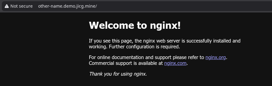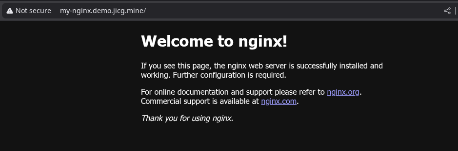 - host: my-nginx.demo.jicg.mineIt means that when an HTTP request comes for http://my-nginx.demo.jicg.mine, it will be mapped to the nginx service: