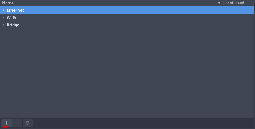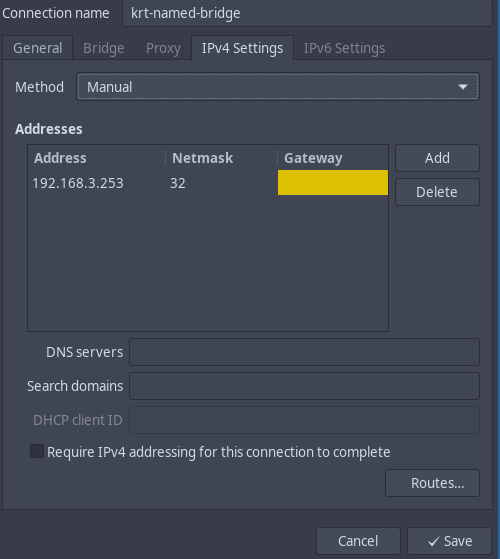 Most Linux desktop systems today use NetworkManager, which has a graphical configuration tool. So, in order to create a new persistent network interface in my laptop which I will use from every virtual server I created a new bridge interface using my graphical interface: