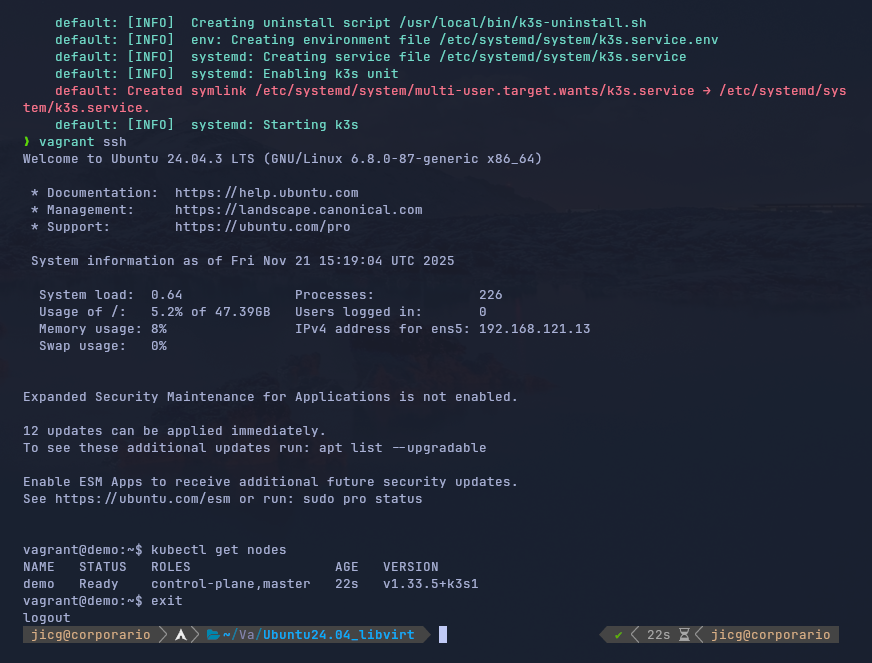I'll do all the process from the deployment of the Virtual server using vagrant with the libvirt provider – basically this consist deploying a new virtual server with a defined IP and I'll show the Vagrantfile used and the shell script used to install K3S when the server starts, no need to type almost anything but vagrant up.